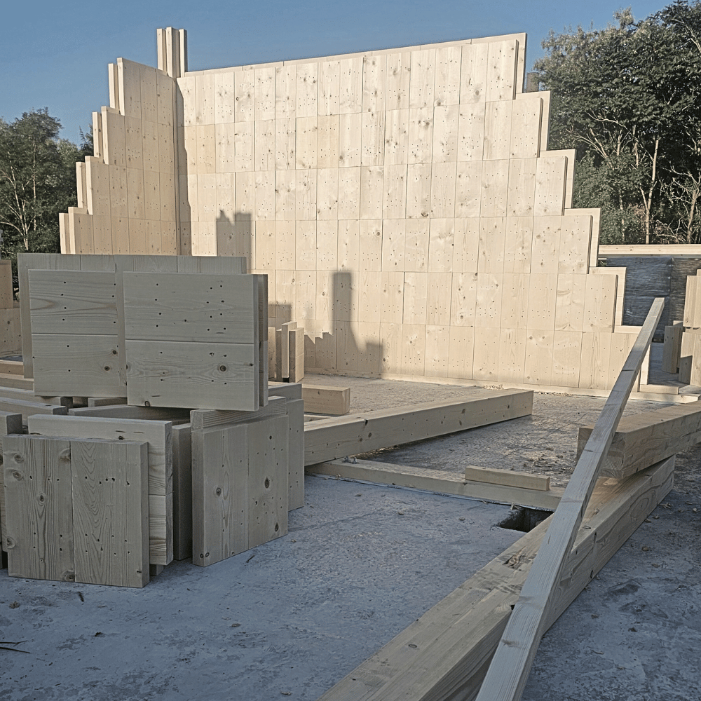 Der NiTO Vollstein, 40 × 40 × 15 cm, 10 kg, ist das Herzstück des Systems. Er besteht aus 6 Holzbohlen, verbunden mit 36 Holznägeln. Kein Leim, kein Metall, keine Chemie. Das 5 cm hohe Nut-Feder-System verzahnt die Steine präzise in alle Richtungen. Die Montage erfolgt ohne Spezialwerkzeug. Komplett rückbaubar und wiederverwendbar.