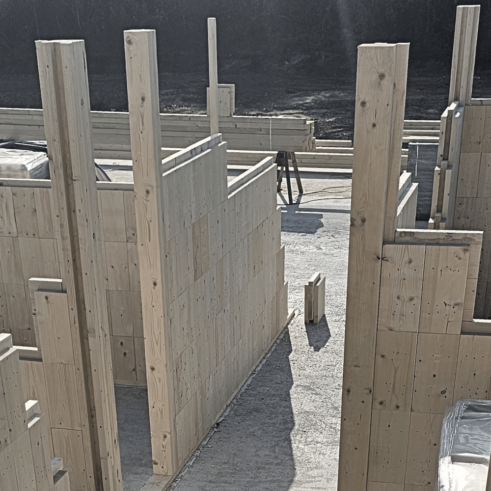 Der NiTO Pfosten, 15 × 15 cm, Länge 3 m, kommt an Ecken, Wand-Anfängen und Wand-Enden sowie neben Türen und Fenstern zum Einsatz. Er verbindet zwei Wände im 90°-Winkel. An Öffnungen trägt er den Sturz. Der Pfosten wird mit NiTO Leisten 5 × 5 cm versehen. So greift das Nut-Feder-System lückenlos.