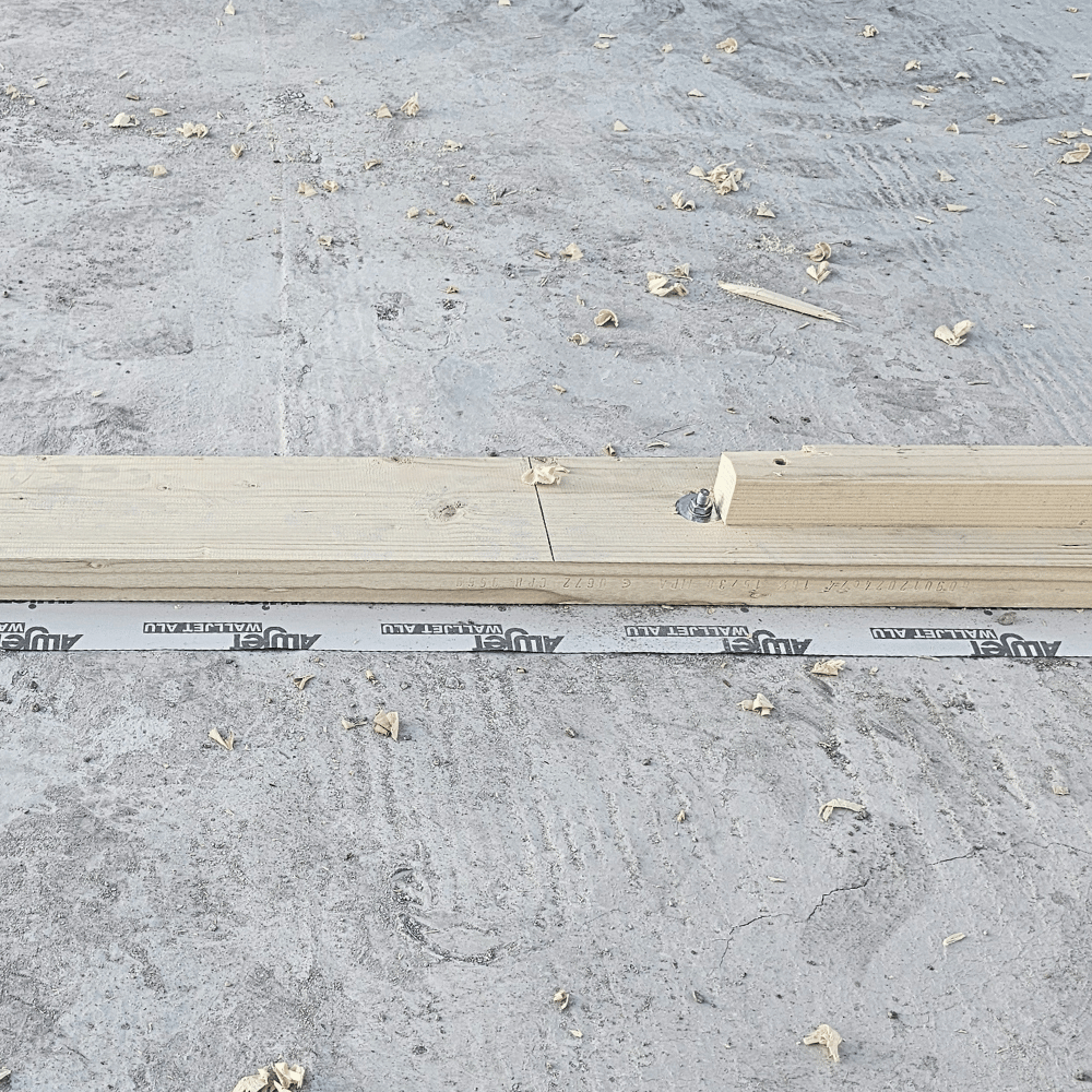 NiTO Richtschwelle aus Massivholz. 15 cm breit, 5 cm hoch, 3 m lang. Wird auf dem Fundament verankert. Bildet die Basis für jede NiTO-Wand.