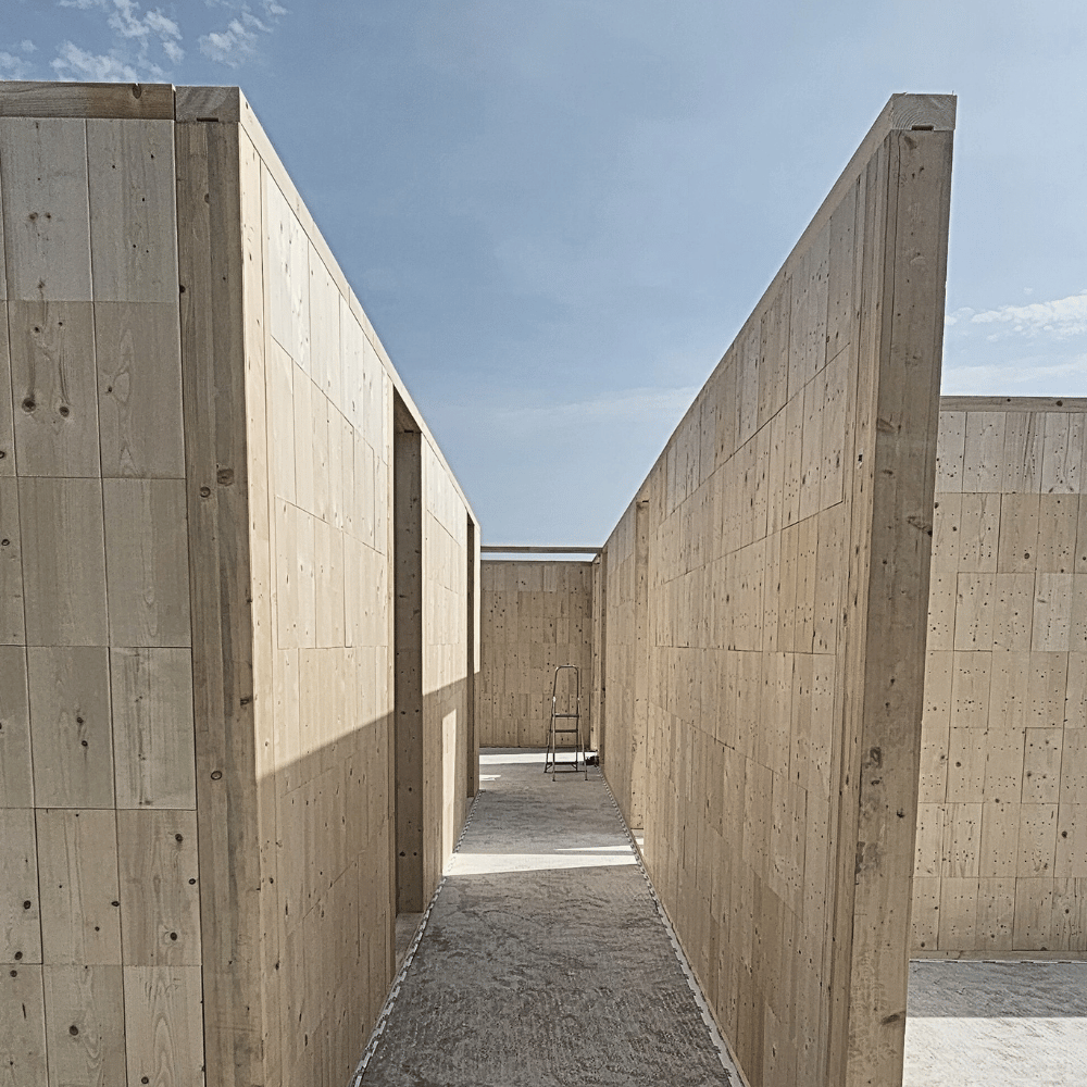 NiTO Zentrierleiste aus Massivholz. 5 cm breit, 2 cm hoch, 3 m lang. Wird mittig auf dem Rähm verschraubt. Leitet Lasten in die äußeren Steinschichten für maximale Stabilität.